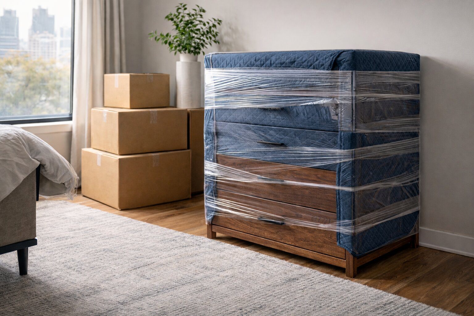 Professional movers also make a huge difference here. When movers properly wrap a dresser with moving blankets and stretch wrap, the drawers are secured and won’t slide open mid-carry. This kind of wrapping turns the dresser into one solid piece, which is safer for both the furniture and the people moving it. If you’re using trained movers for furniture transport, they’ll usually assess the dresser on the spot and let you know whether leaving clothes inside is okay or if emptying it is the safer call.